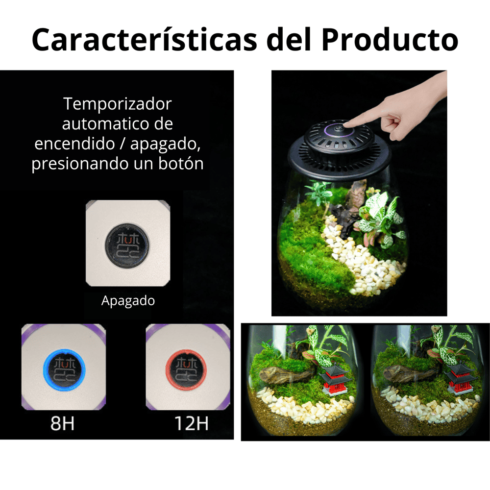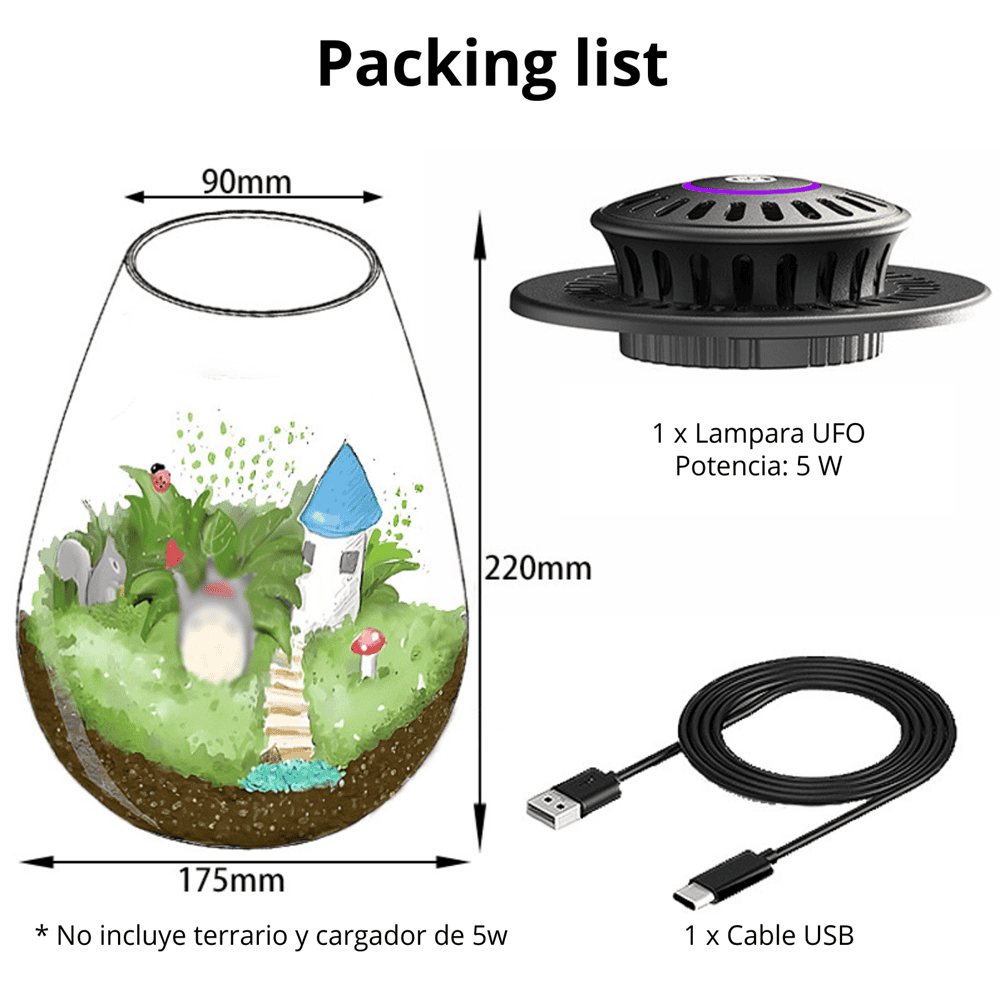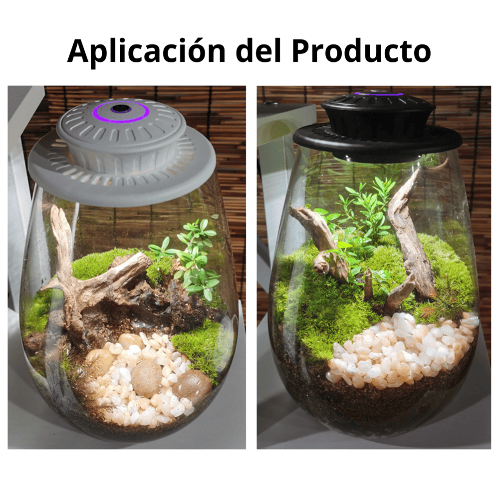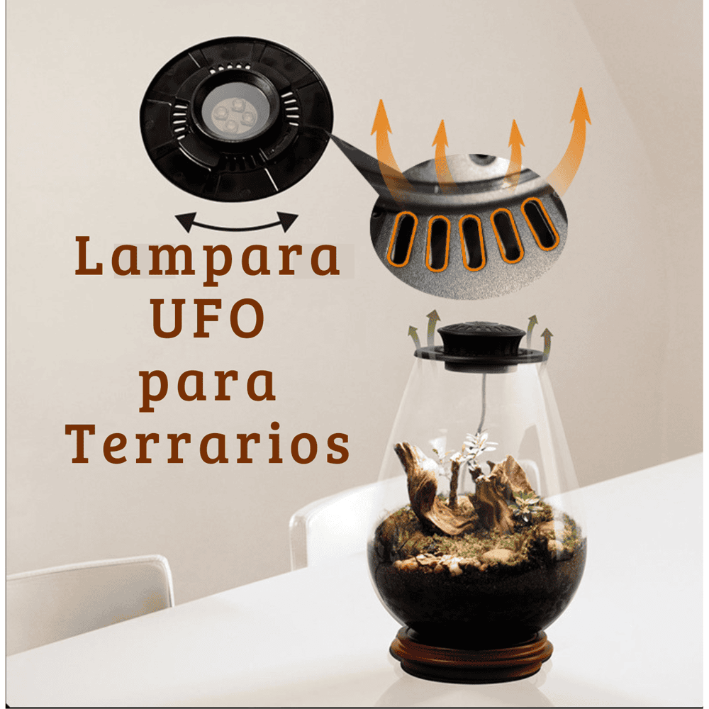 La lampara UFO, esta diseñada para la iluminación de pequeños terrarios o vivarium. Su estilo minimalista y moderno, brinda sofisticación y resalta el pasaje creado dentro de estos pequeños mundos.